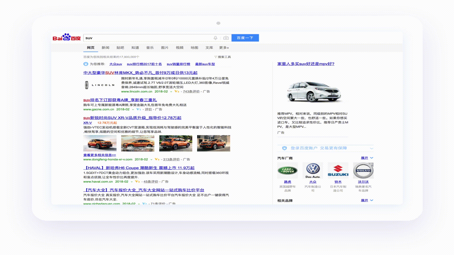 通過關鍵詞精準匹配展現在網頁右側的圖文品牌展示類推廣。産品主要針對客戶的品牌推廣營銷策略,将 通用詞(如(rú)智能手機,三國殺,歐洲自(zì)由行,英語培訓等),節日(rì)詞(如(rú)國慶節,聖誕節)等關鍵詞占爲己有,在網頁搜索結果頁右側将品牌信息前置,樹立和強化企業的品牌影(yǐng)響力。